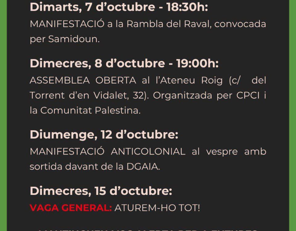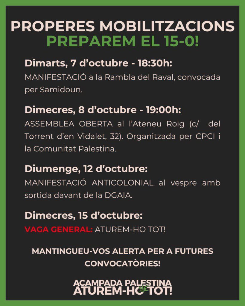 PROPERES CONVOCATÒRIES Des de l’Acampada Palestina, després d’haver-la aixecat ahir, volem recordar que ho hem fet per centrar tots els esforços en les properes mobilitzacions […]