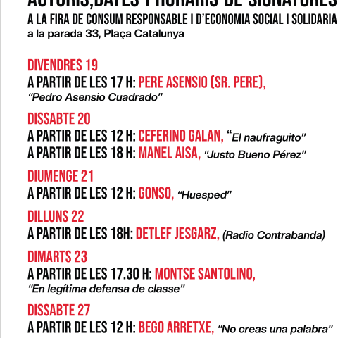 Autoris,dates i horaris de signatures a la Fira de consum responsable i d’economia social i solidaria a la parada 33, Plaça Catalunya