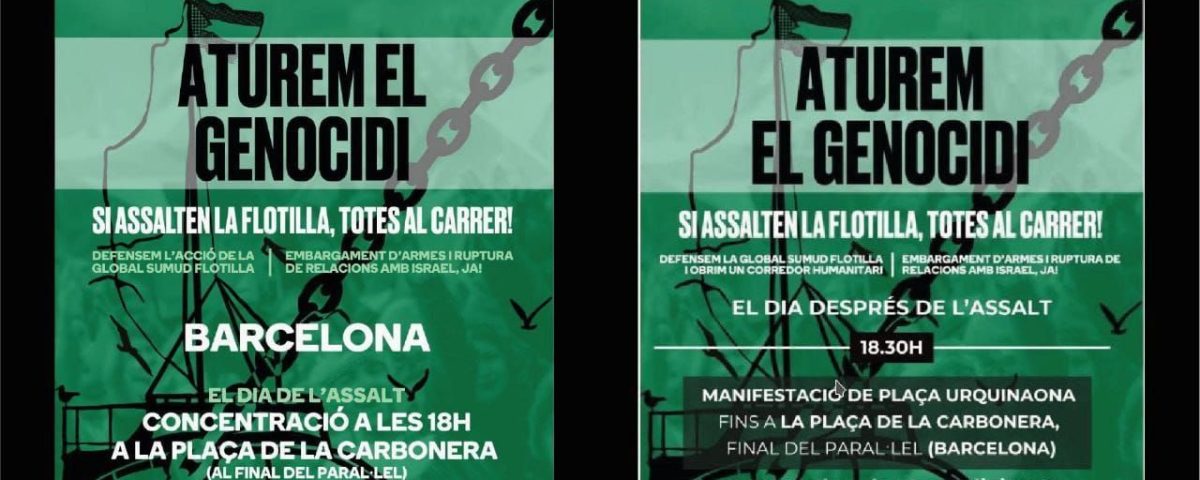 El dia que assaltin la flotilla: concentració d’urgència a la Plaça de la Carbonera (al final de Paral·lel). Ens trobem totes allà per mostrar suport i donarem més instruccions!