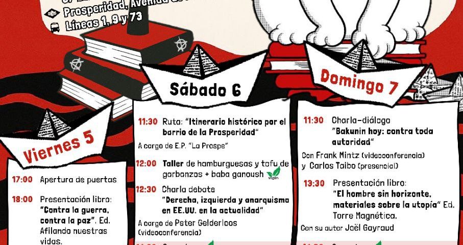 Nuestra XXIII edición se celebrará los días 5, 6 y 7 de diciembre en la Escuela Popular de Prosperidad, “LA PROSPE”, (C/ Luis Cabrera 19). Seguimos trabajando, preparando presentaciones de libros, charlas, debates que nos hagan reflexionar acerca del mundo en el que vivimos y la alternativa que proponemos desde el anarquismo. La actualidad es desbordante, con una sociedad cada vez más derechizada, guerras o los eufemísticamente llamados “conflictos” (más de 50) y genocidios retransmitidos en directo en la televisión y en las redes, compañeros/as anarquistas detenidos en numerosos países por alzar su voz contra las barbaries cometidas tanto por gobiernos abiertamente dictatoriales como por demócratas. Los y las libertarias siempre hemos encontrado un espacio entre los libros para hablar de lo actual, proponer alternativas o recuperar lo que ya manifestaban los padres y las madres del anarquismo. Son muchas las editoriales que siguen con la labor de promover nuestras ideas, con autor@s viej@s y nuev@s, a las que queremos dar un lugar para hablar y transmitir nuestras ideas. Con muchas ganas, esperamos vernos en diciembre. Salud